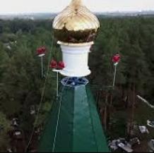 ПОДЪЕМ ШАТРА НА КОЛОКОЛЬНЮ И ГЛАВКИ С КРЕСТОМ.
